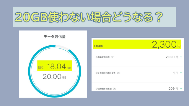 また、基本データ容量20GB使わないからといって、料金割引はありません。基本データ容量20GBのうち1GBしか使わなくても月額2700円(税込2970円)がかかります。