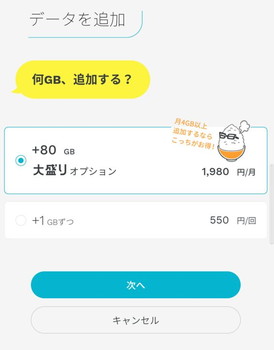 ahamoの基本データ容量20GBでは足りずに大盛りオプション(80GB増量)に加入したら月額1980円(税込)が別途かかります。