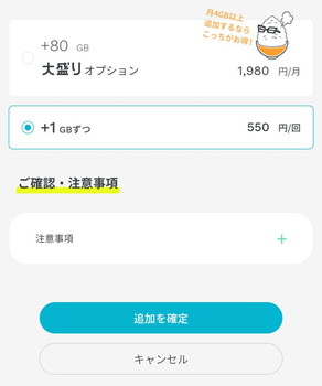ahamoの基本データ容量20GBでは足りずに大盛りオプション(80GB増量)に加入したら月額1980円(税込)が別途かかります。