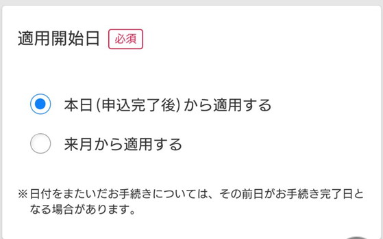 ahamo24時間かけ放題オプションは、適用開始日を「本日(申込完了後)から適用する」「来月から適用する」を選択できます。