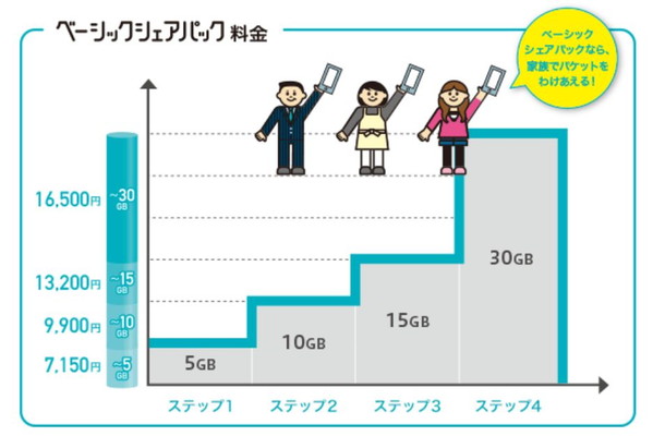 ベーシックシェアパックにてステップ1を契約し、家族でデータ通信を使っていた場合、使用データ量が5GBを超えたら、ステップ2に移行します。