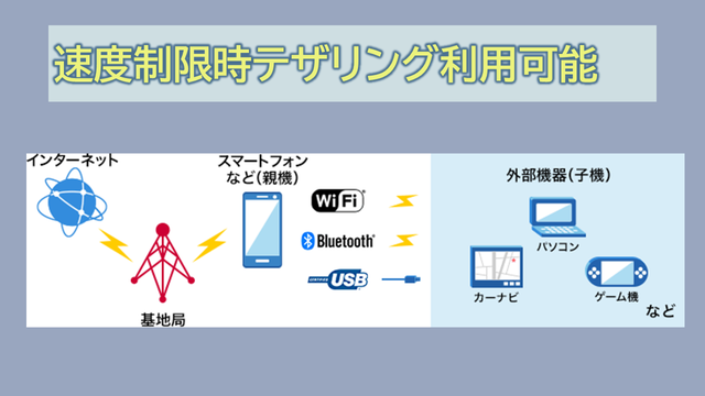 スマホをタブレットやPCにつなげて通信を行うテザリングも、1Mbpsでも利用できます「。
