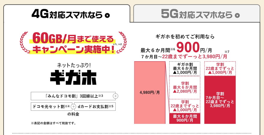 ギガホは月額4980円、5Gギガホは月額5480円から最大6カ月1000円割り引く「ギガホ割」「5Gギガホ割」も同時適用され、当初6カ月間、ギガホならわずか月額900円、5Gギガホなら月額980円で利用できます。