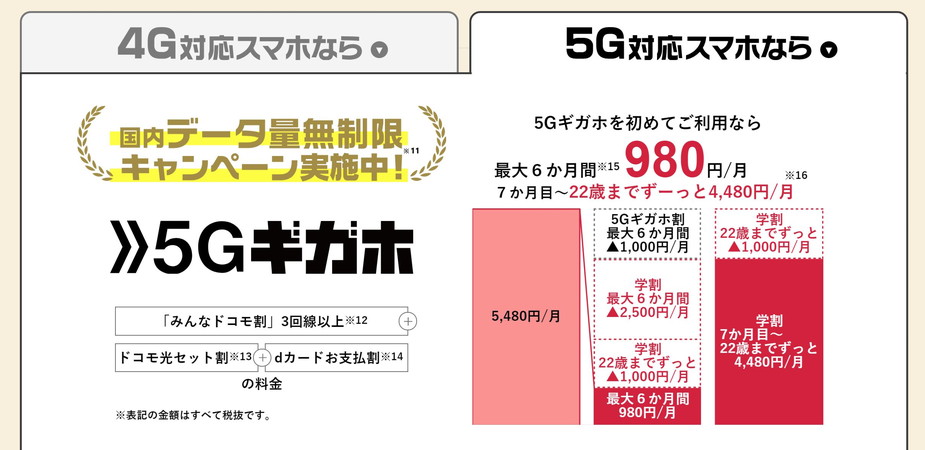 | 5Gギガホ | 3,500円/月 割引 | 1,000円/月 割引 |