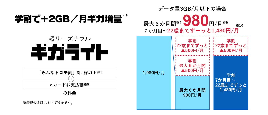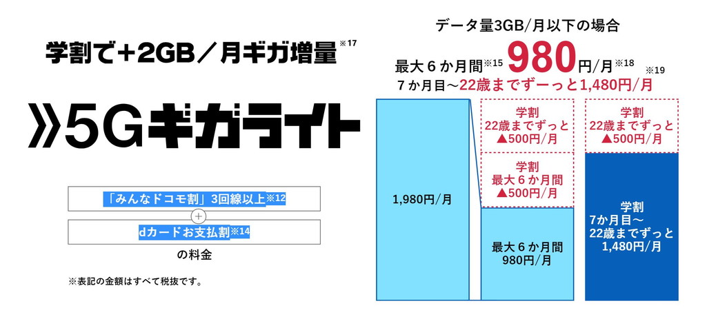 「5G ギガライト」「ギガライト」については、毎月500円の割引と 2GBのデータ増量を、22 歳までずっと継続します。