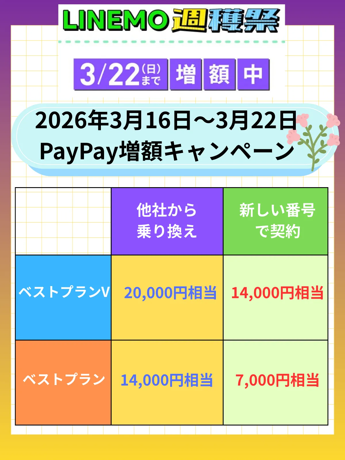 LINEMOならベストプランは5940円のPayPayポイント還元、ベストプランVなら他社から乗り換えで15000円のPayPayポイントが常時還元しています。