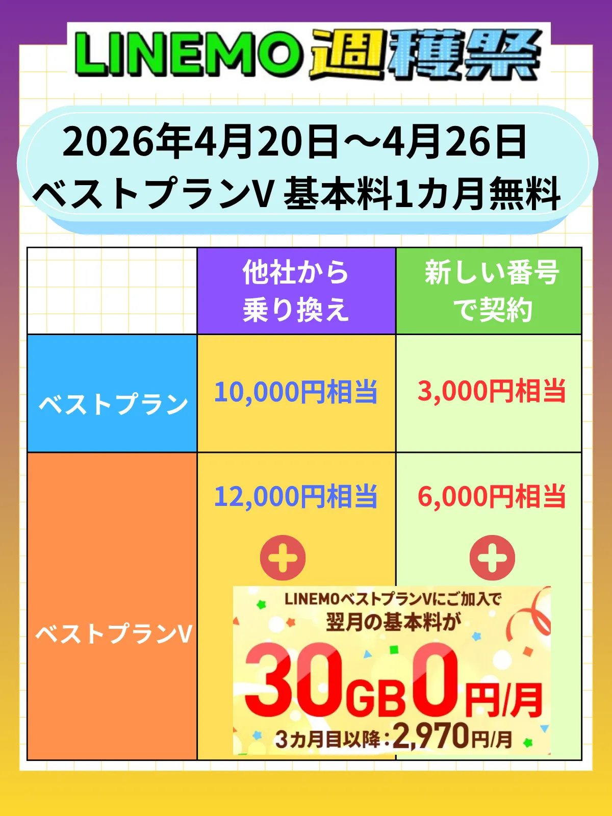 | 特典付与条件 | 受付期間内にLINEMOへ新規、他社からの乗り換え(MNP)、ソフトバンクまたはワイモバイルからの乗り換えで契約すること。 |